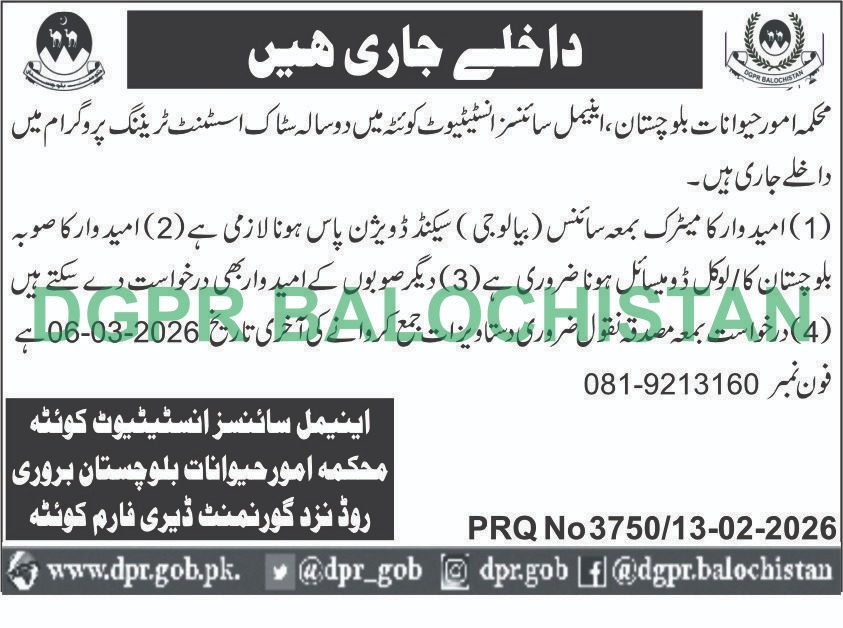 Adv-JobsAdmissions Open for 2-Year Training Program at Animal Sciences Institute Quetta under Livestock Department BalochistanFebruary 15, 2026February 15, 2026Comments (0)Shams Ur Rehman Anas Hussain