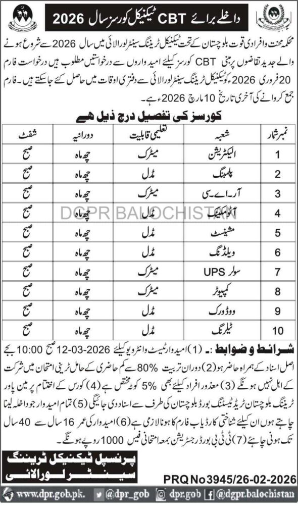 Admissions Open for CBT Courses at Technical Training Center Loralai Under the Labor & Manpower Department Balochistan