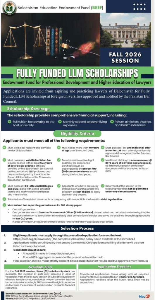 Announcement of Fully Funded LLM Scholarships (Fall 2026) for Eligible Lawyers of Balochistan under the Balochistan Education Endowment Fund (BEEF)