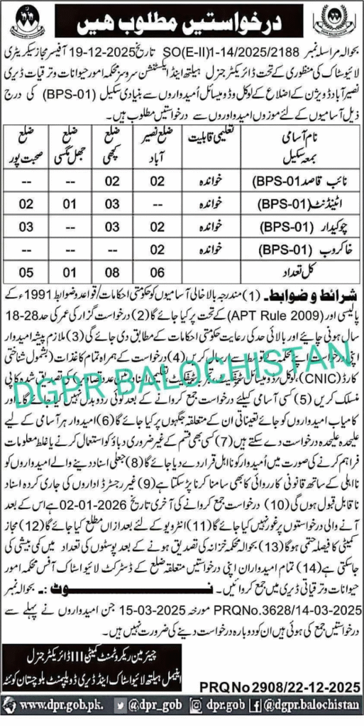Adv-JobsApplications Invited for Class IV Vacancies at Animal Health & Dairy Farm, Livestock Department Balochistan (Naseerabad Division)December 22, 2025December 22, 2025Comments (0)Shams Ur Rehman Anas Hussain