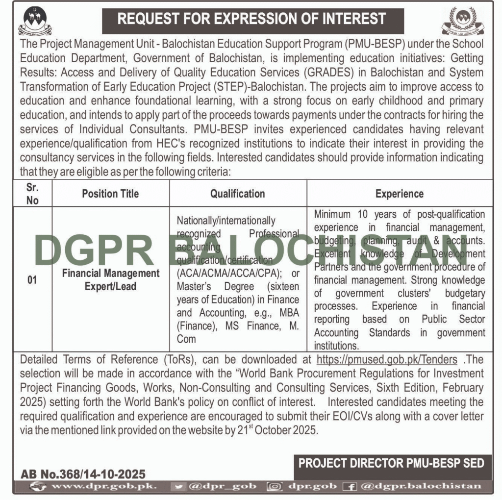 Applications Invited for Financial Leader/Expert (Consultant) – School Education Department (PMU-BESP) Balochistan