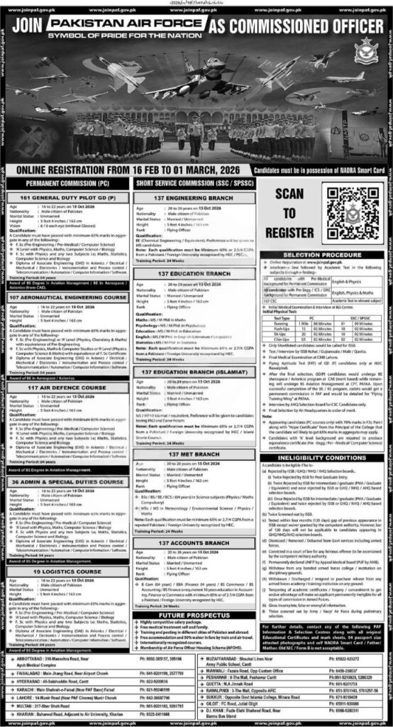 Adv-JobsApplications Invited for Pakistan Air Force Permanent Commission (PC) and Short Service Commission (SSC/SPSSC) CoursesFebruary 17, 2026February 17, 2026Comments (0)Shams Ur Rehman Anas Hussain