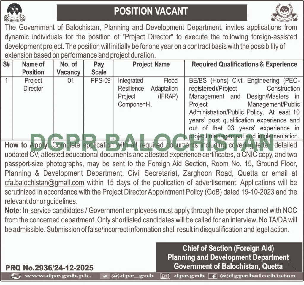 Adv-JobsApplications Invited for Project Director (PPS-09)Planning & Development Department, BalochistanDecember 26, 2025December 26, 2025Comments (0)Shams Ur Rehman Anas Hussain