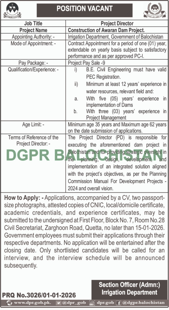 Adv-JobsApplications Invited for Project Director (PPS-9) on Temporary Basis for Awaran Dam Project, Irrigation Department, Government of BalochistanJanuary 1, 2026January 1, 2026Comments (0)Shams Ur Rehman Anas Hussain