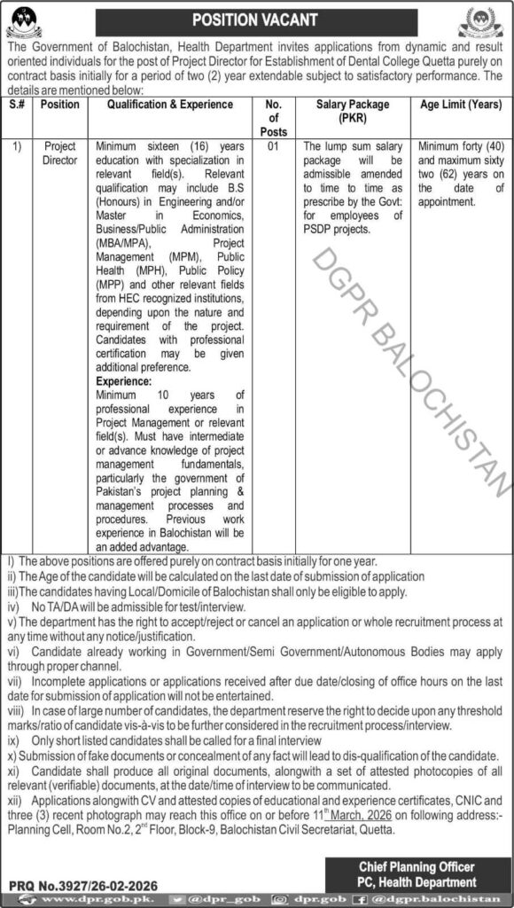 Applications Invited for Temporary Appointment to the Vacant Position of Project Director, Nasirabad, by the Health Department Balochistan