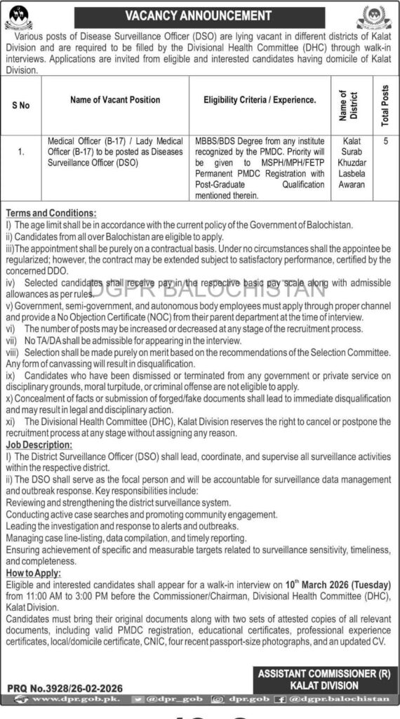 Applications Invited for Temporary Appointment to the (B-17) DSO Vacant Position in Kalat Division by the Health Department Balochistan