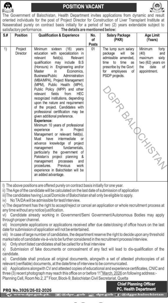 Previous PostApplications Invited for Temporary Appointment to Project Director Vacant Positions by the Health Department BalochistanNext PostApplications Invited for Temporary Appointment to Grade 14–15 Vacant Positions in Musa Khel District by the School Education Department Balochistan