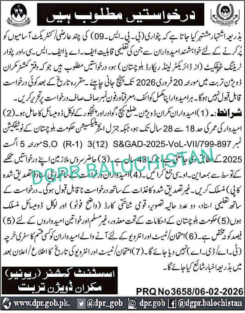 Applications Invited for Temporary BPS-09 Posts in the Office of Assistant Commissioner (Revenue), Makran Division, Turbat
