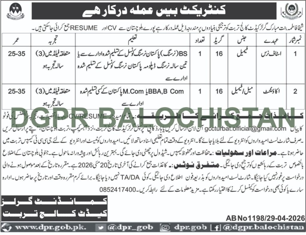 Applications Invited for Temporary Positions at Girls Cadet College Turbat