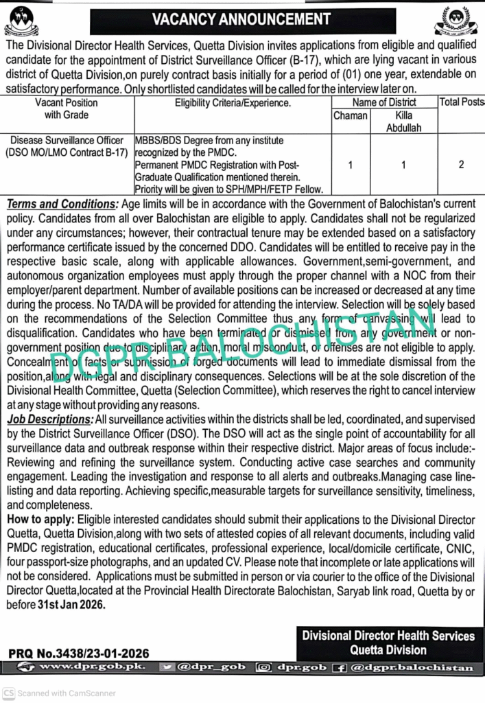 Applications Invited for Temporary Recruitment Against Vacant DSO MO/LMO (BPS-17) Posts in Districts Chaman and Qilla Abdullah, Quetta Division