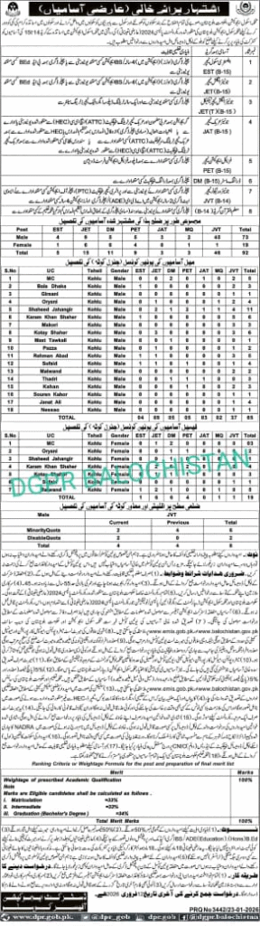 Applications Invited for Temporary Recruitment Against Vacant Posts in District Kohlu Under the Approved 2024 Policy of the Balochistan School Education Department