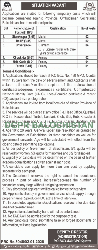 Adv-JobsApplications Invited for Temporary Recruitment to Class IV Vacant Positions at the Provincial Ombudsman Secretariat, BalochistanJanuary 3, 2026January 3, 2026Comments (0)Shams Ur Rehman Anas Hussain