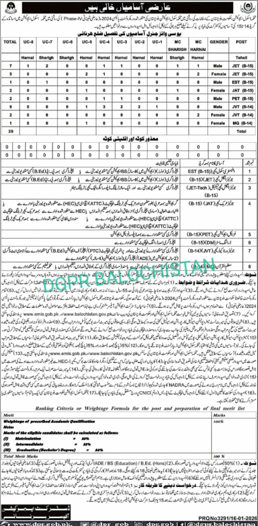 Applications Invited for Temporary Teaching Positions (BPS-14 & BPS-15) in District Harnai under the Approved Recruitment Policy 2024 of the School Education Department, Government of Balochistan