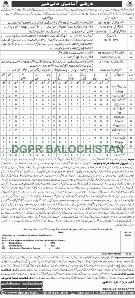 Applications Invited for Temporary Vacancies (Grade 14–15) in the School Education Department, Balochistan, for Candidates from Nushki District