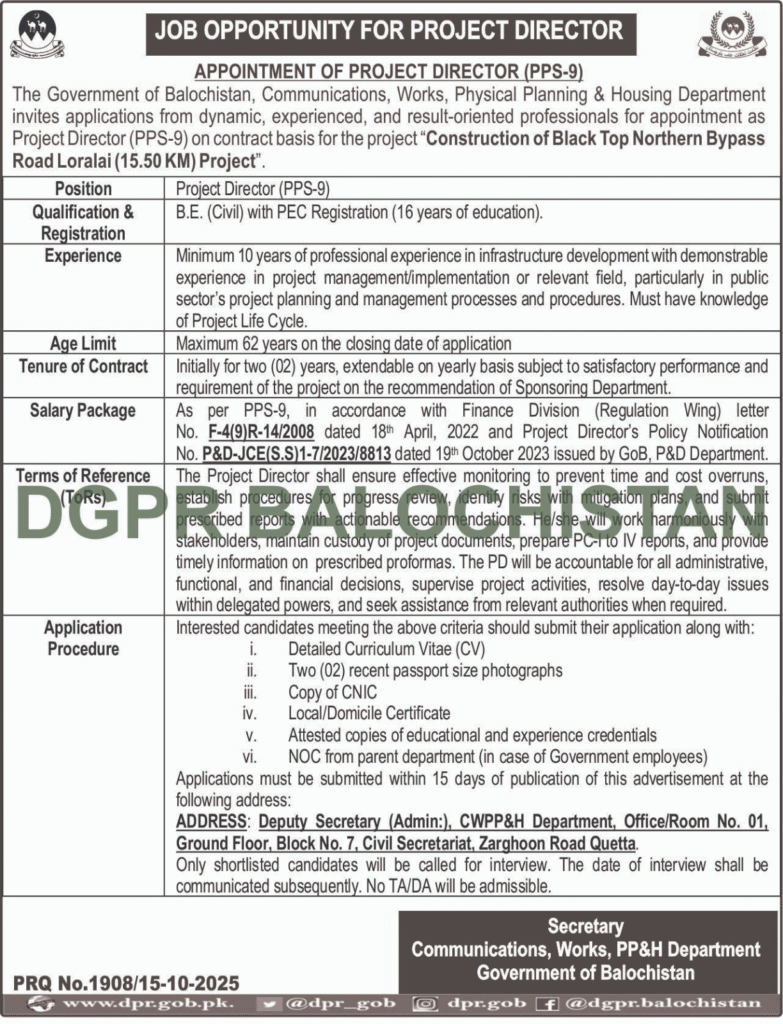 Applications Invited for the Position of Project Director – Balochistan Communication Works, Physical Planning & Housing Department