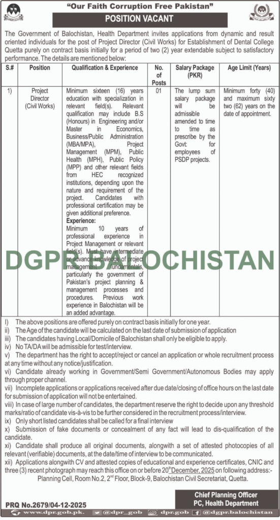 Applications Invited for the Position of Project Director (Civil Works), Quetta – Health Department Balochistan