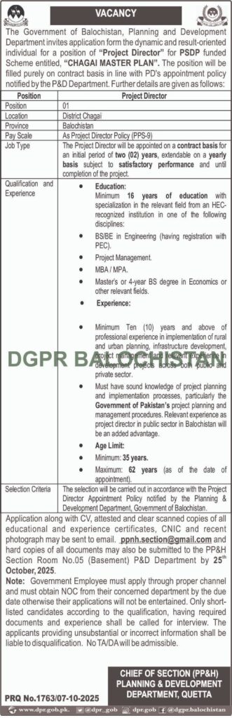 Applications Invited for the Post of Project Director (Chaghi Master Plan) – Planning & Development Department, Balochistan