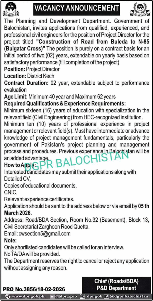 Applications Invited for the Post of Project Director (Temporary Basis) – Balochistan Planning & Development Department