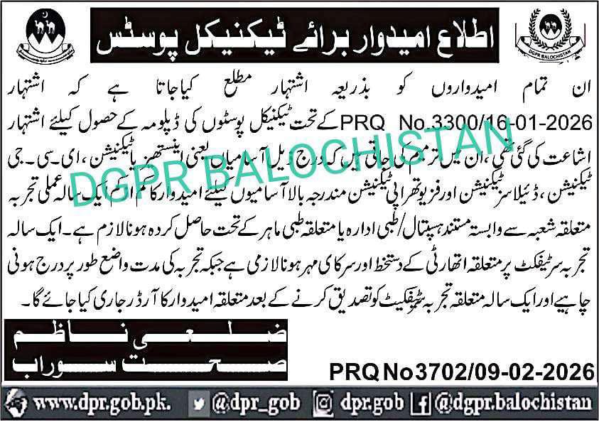 Applications Invited from Experienced Candidates for Technical PostsDistrict Health Officer, Surab