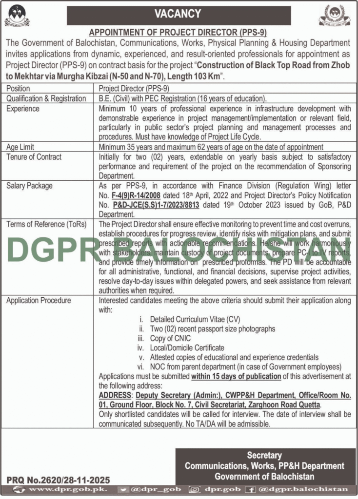 Adv-JobsApplications Invited – Project Director (PPS-9), Balochistan Communication Works, Physical Planning & Housing DepartmentNovember 28, 2025November 28, 2025Comments (0)Shams Ur Rehman Anas Hussain