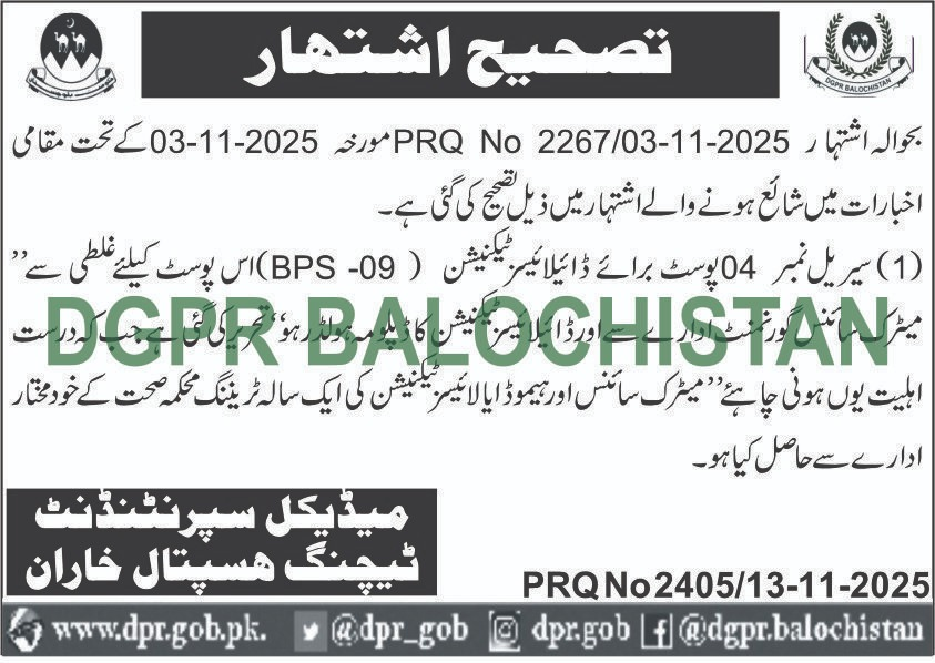 Adv-JobsApplications Invited: Revised Criteria for Vacancies at Medical Superintendent Teaching Hospital, Kharan, Department of Health BalochistanNovember 21, 2025November 21, 2025Comments (0)Shams Ur Rehman Anas Hussain
