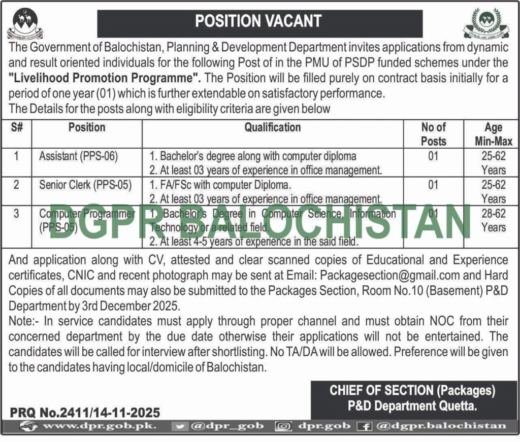 Adv-JobsApplications Invited: Temporary Vacancies for Livelihood Program under PMU-PSDP, Planning & Development Department BalochistanNovember 21, 2025November 21, 2025Comments (0)Shams Ur Rehman Anas Hussain
