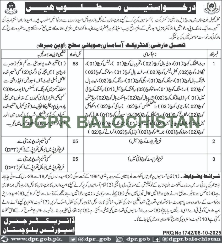 Applications Invited: Temporary Vacancies in Sports Department Balochistan for Local/Domicile Holders