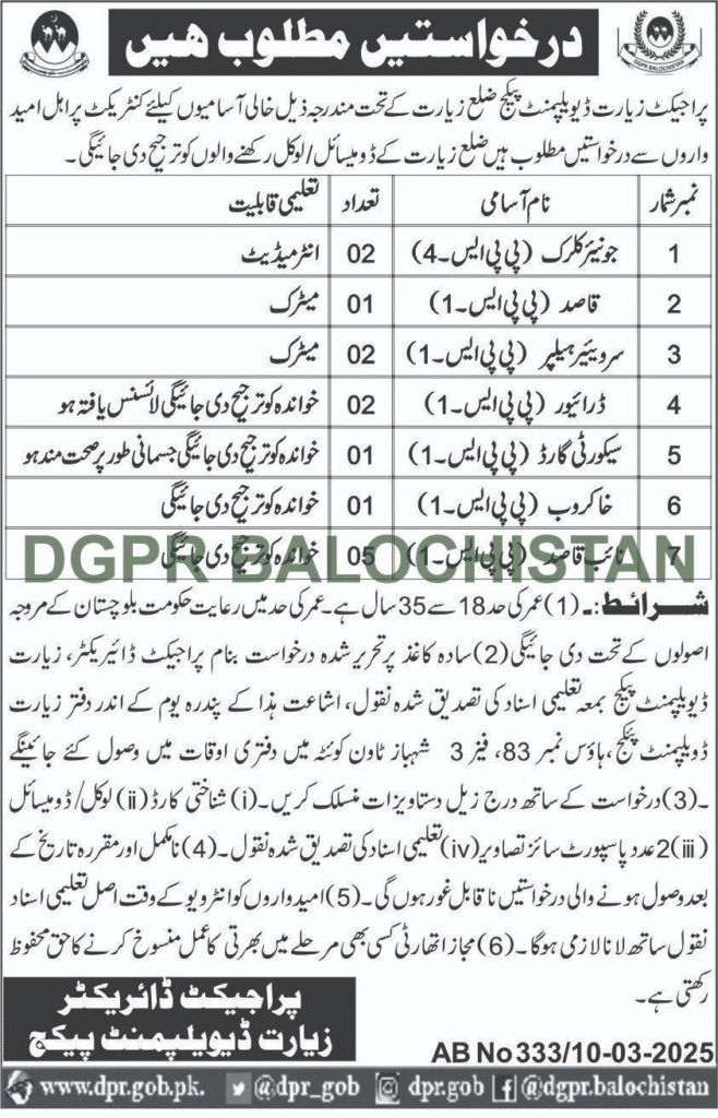 Applications Invited: Temporary Vacancies under Ziarat Development Package, District Ziarat