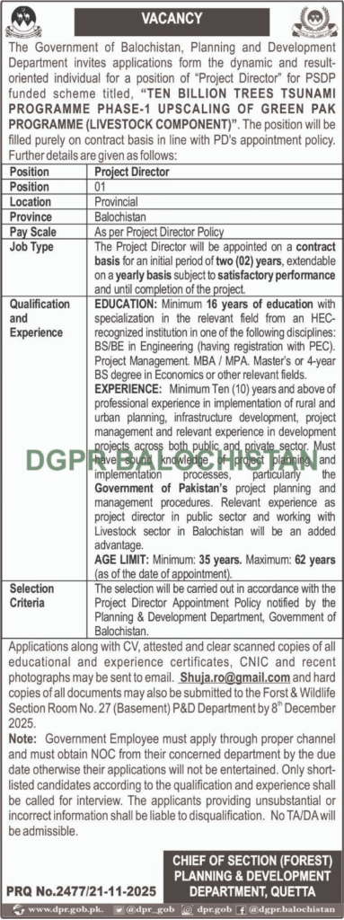 Applications Invited: Temporary Vacancy for Project Director, PSDP Green Pak Program, Planning & Development Department Balochistan