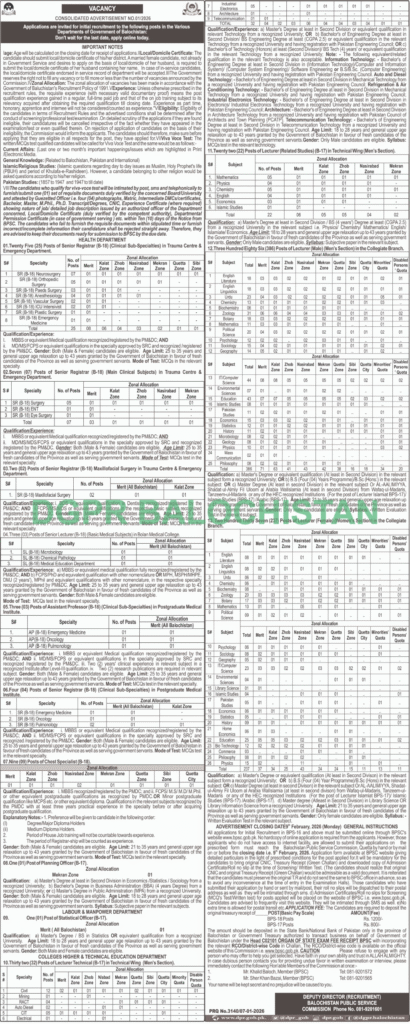 The Balochistan Public Service Commission invites applications from eligible candidates for recruitment against vacant posts in various departments in BPS-17 to BPS-18.