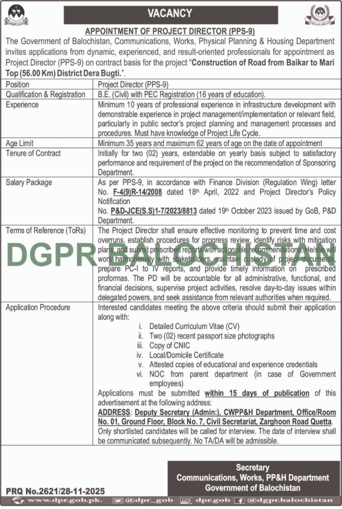 Applications Required – Project Director (PPS-9), Balochistan Communication Works, Physical Planning & Housing Department