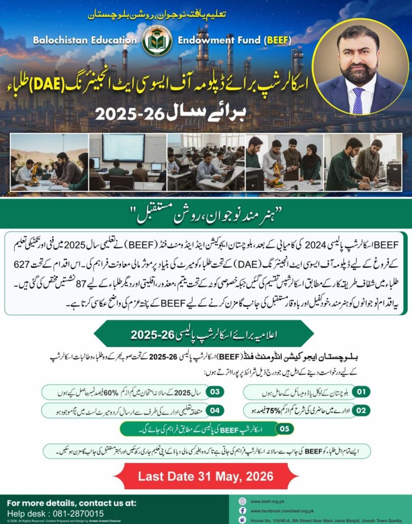BEEF Announces DAE Scholarship Program 2025–2026 to Empower Students in Balochistan