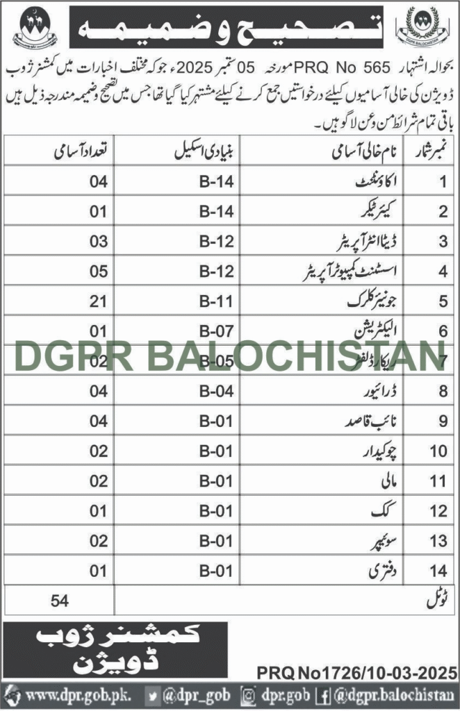 Correction and Addendum: Revised Vacancies Announced by Commissioner Zhob Division