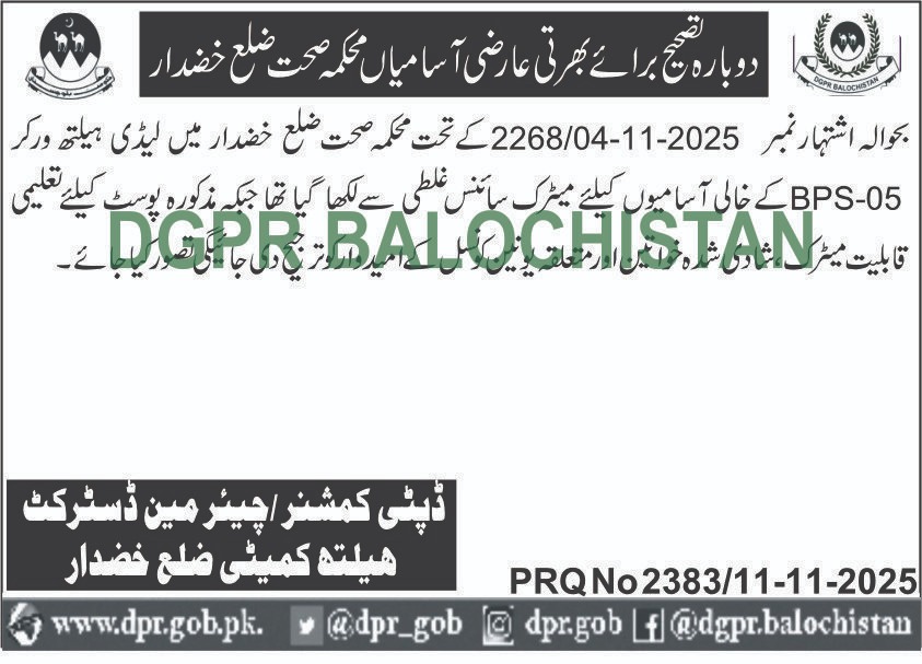 Correction Notice for Vacancies – Health Department District Khuzdar