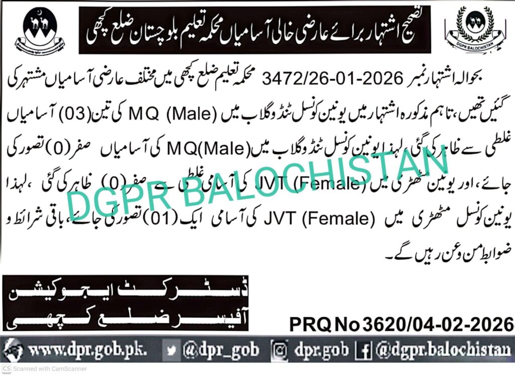 Adv-JobsCorrigendum: Temporary Vacancies for District KachhiFebruary 6, 2026February 6, 2026Comments (0)Shams Ur Rehman Anas Hussain