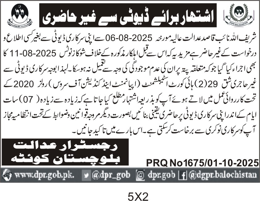 Applications Invited for Various Posts at Advocate General Office Balochistan