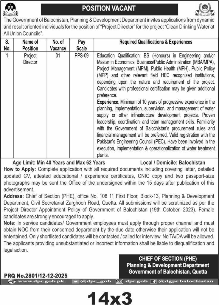 Applications Invited for Project Director Position – Balochistan Planning & Development Department