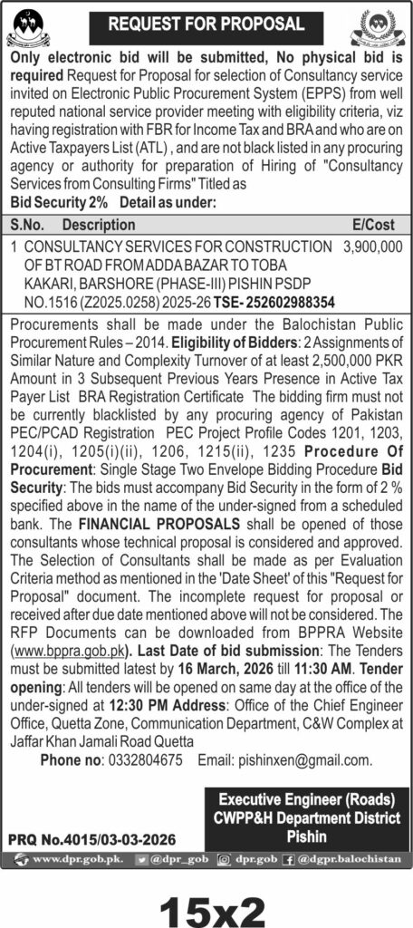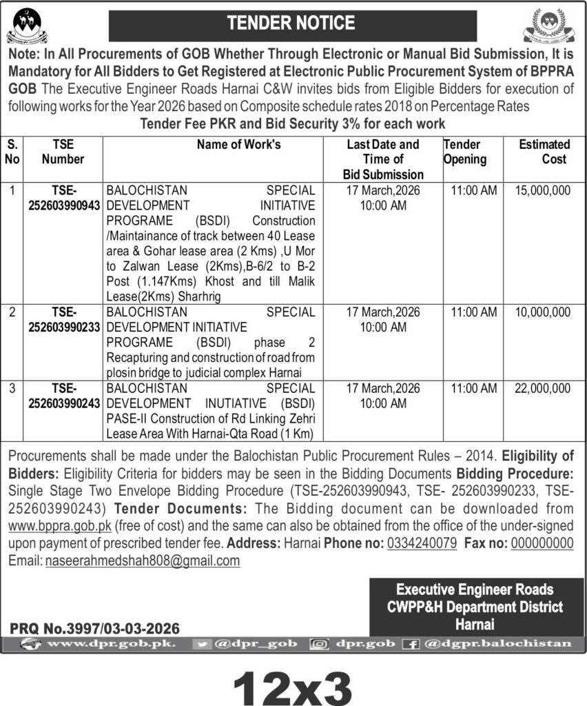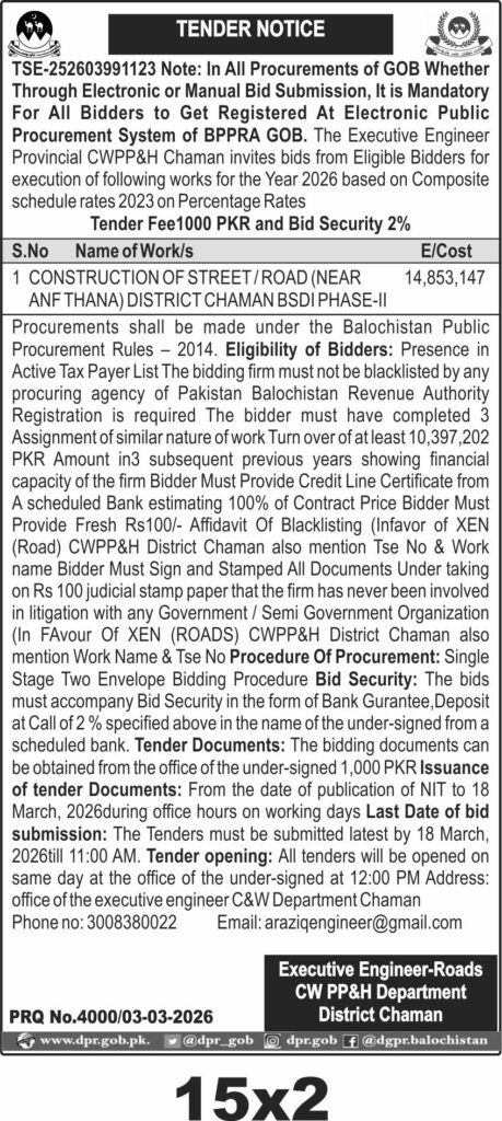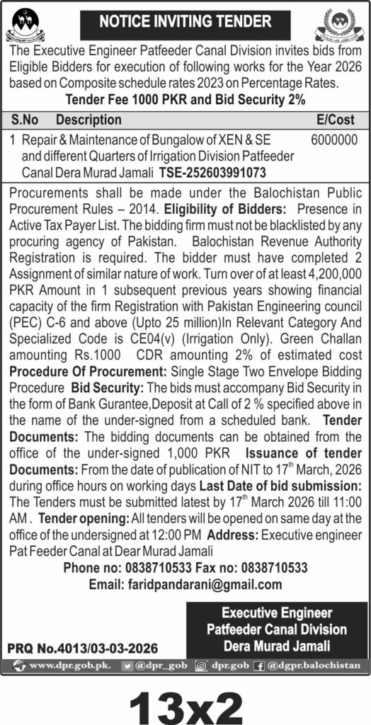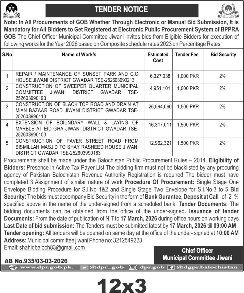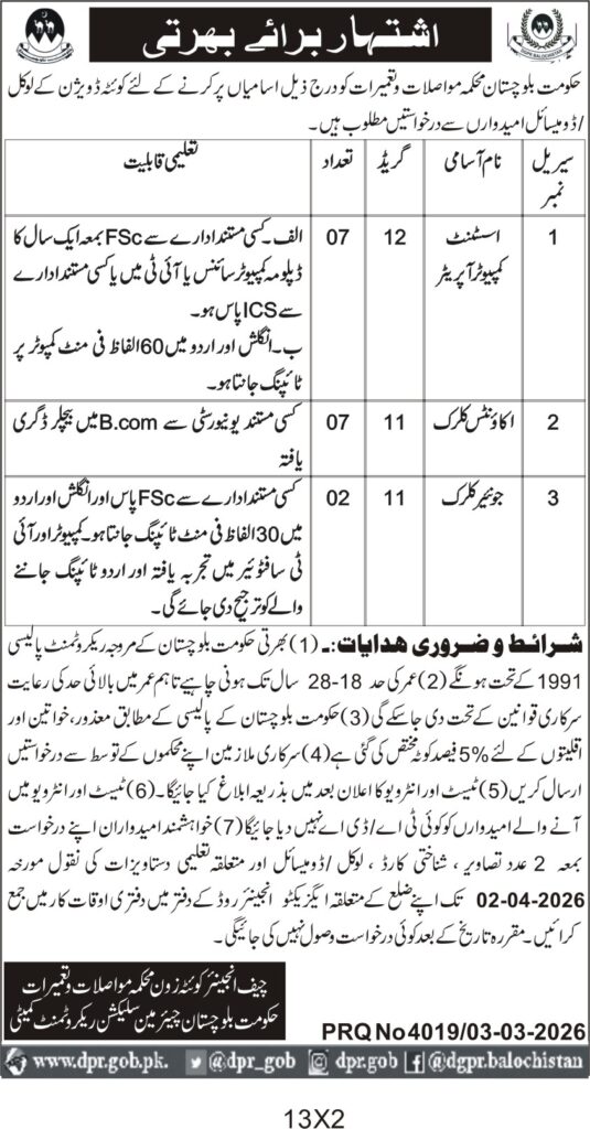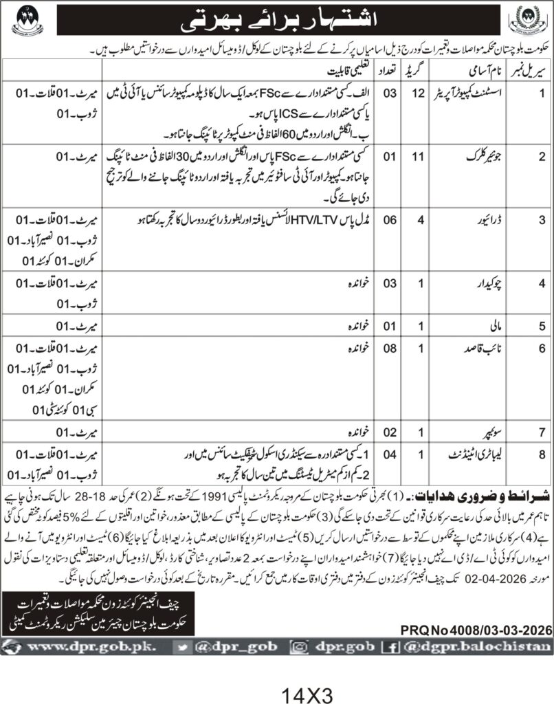 Applications Invited for Vacancies in the Communication and Works Department, Quetta District, Government of Balochistan