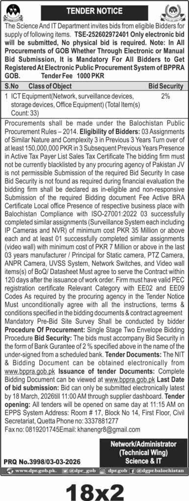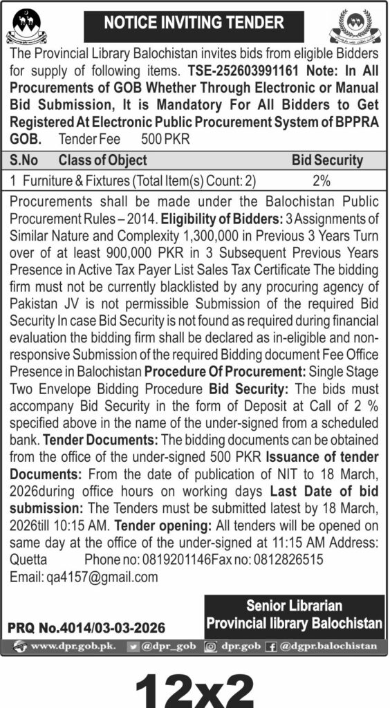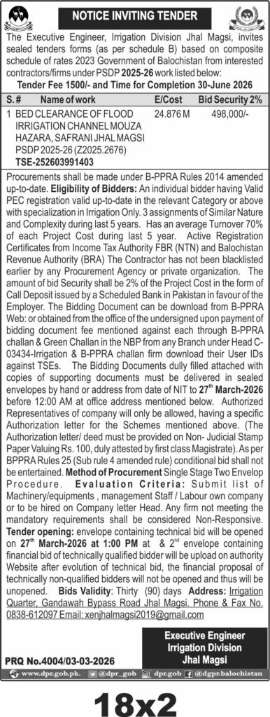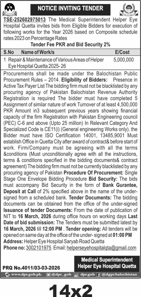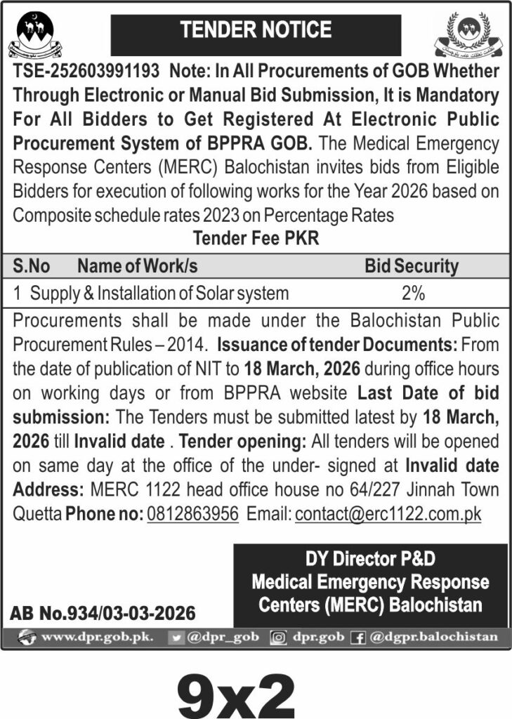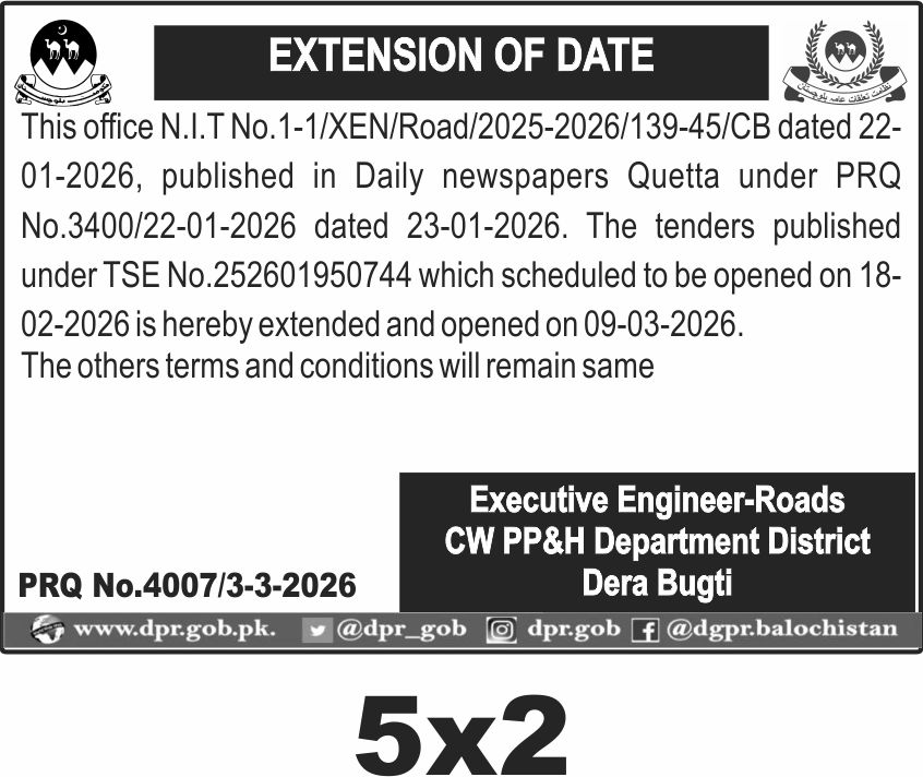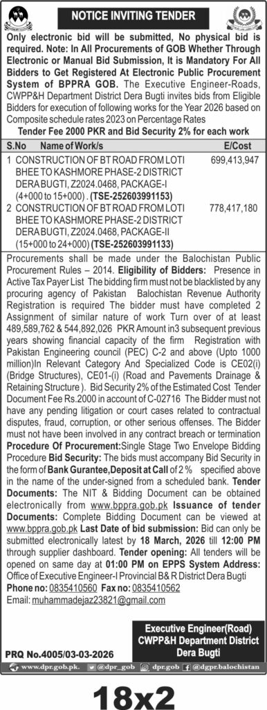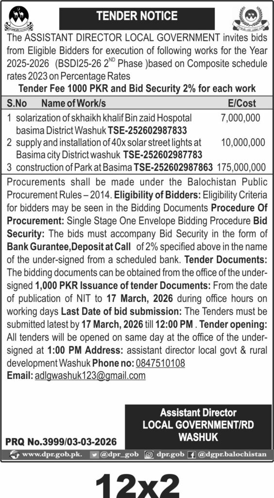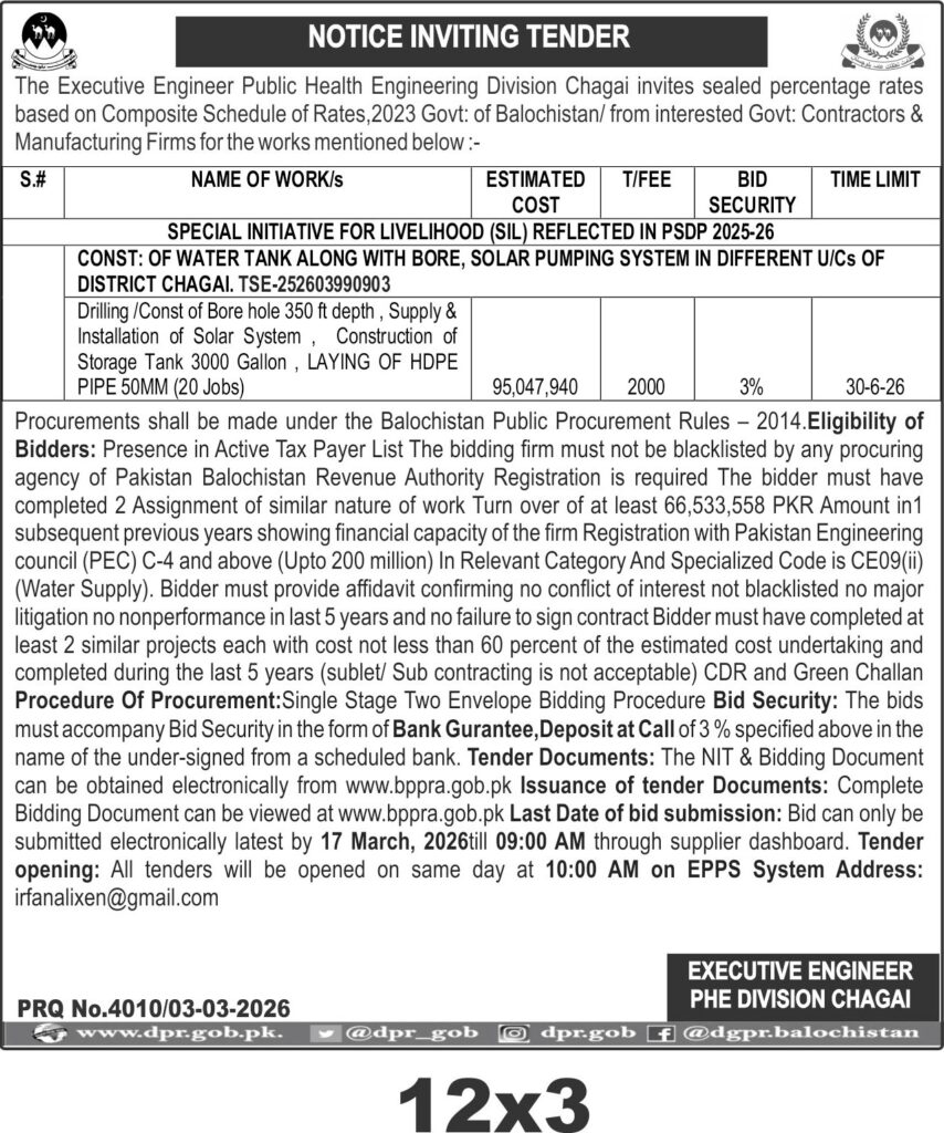 Applications Invited for Vacancies in the Communication and Works Department, Quetta District, Government of Balochistan