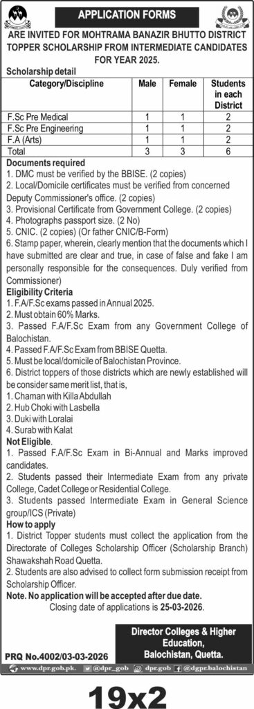 Applications Invited from District Topper Students for the 2025 Benazir Bhutto District Topper Scholarship by the Colleges & Higher Education Department, Balochistan, Quetta