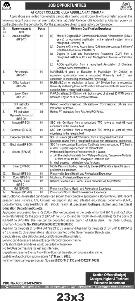 Applications Invited for Temporary Vacancies at Cadet College Qila Abdullah, Chaman, for Eligible Local/Domicile Candidates of Balochistan