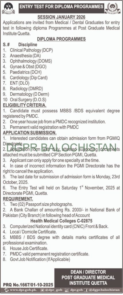 Entry Test Announcement – Diploma Programs, Postgraduate Medical College Quetta