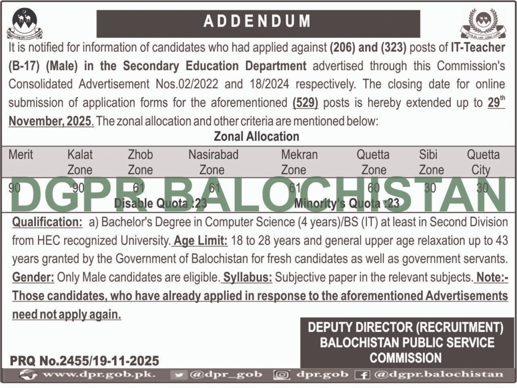 Adv-JobsExtension of Deadline for Vacancies – Secondary Education Department, Balochistan Public Service CommissionNovember 21, 2025November 21, 2025Comments (0)Shams Ur Rehman Anas Hussain