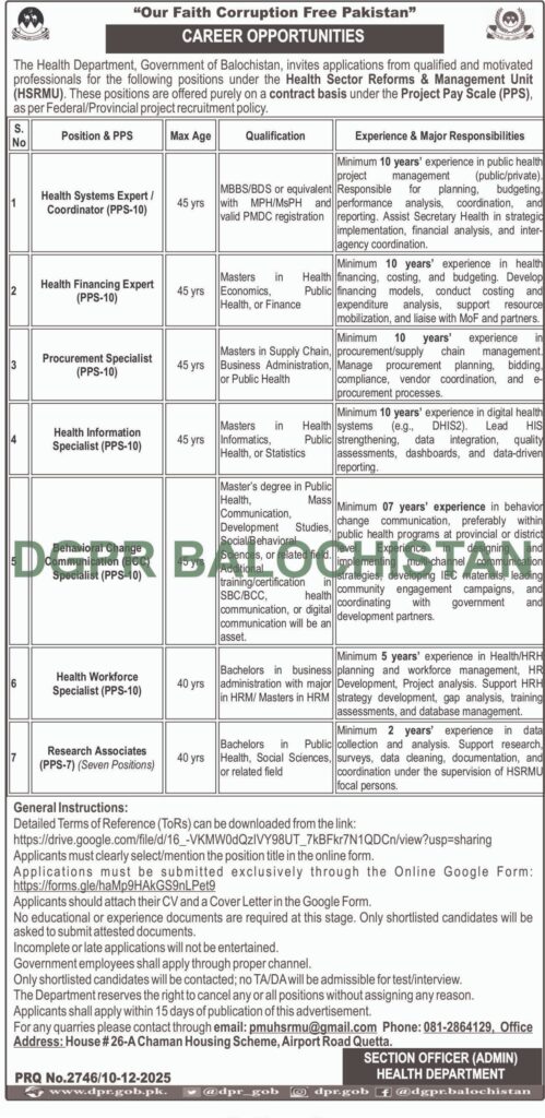 Adv-JobsHealth Department Balochistan Announces Multiple VacanciesDecember 12, 2025December 12, 2025Comments (0)Shams Ur Rehman Anas Hussain