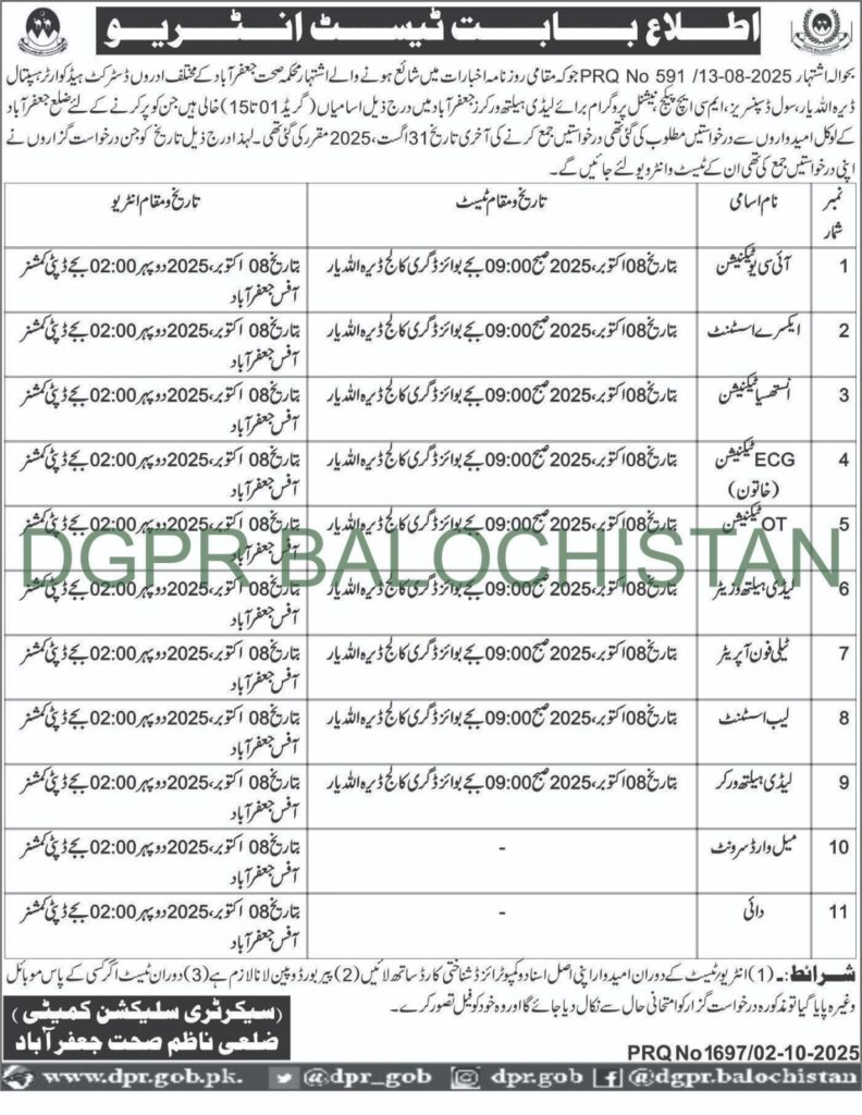 Health Department Jaffarabad Issues Test & Interview Schedule for Grade 01–15 Posts
