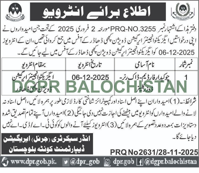 Adv-JobsInterview Announcement – Executive Engineer Irrigation Division DhadarNovember 28, 2025November 28, 2025Comments (0)Shams Ur Rehman Anas Hussain