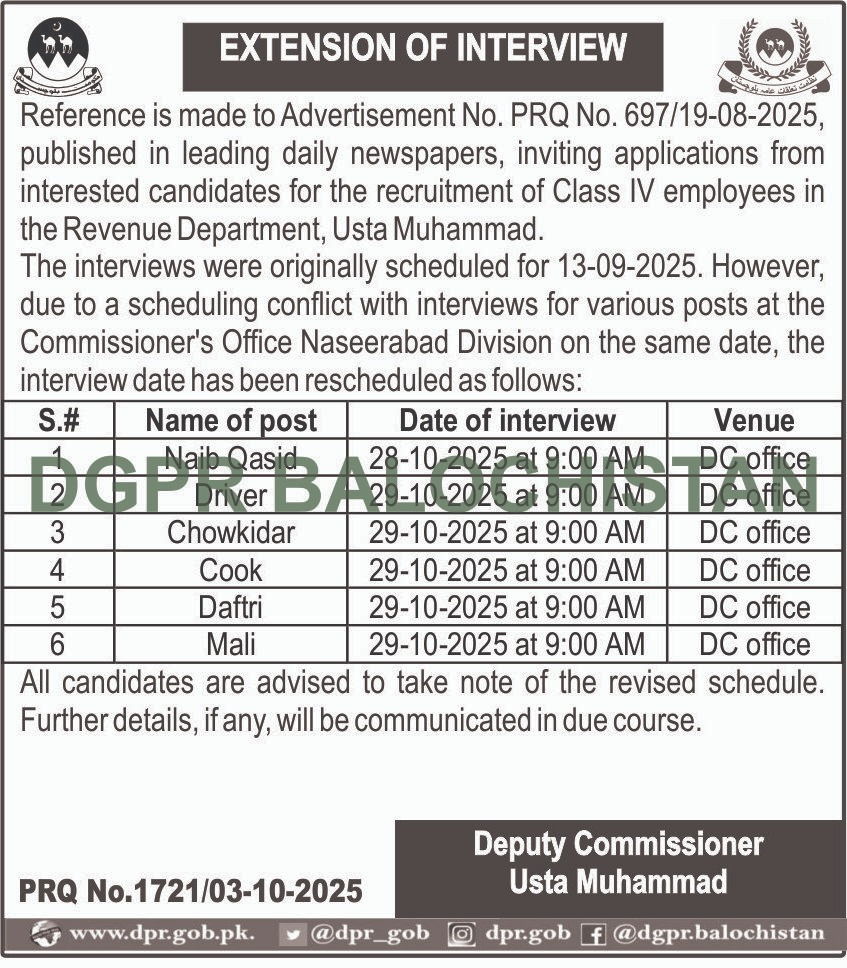 Interview Correction Notice: Revised Interview Dates for Class-IV Posts, District Usta Muhammad – Revenue Department Balochistan