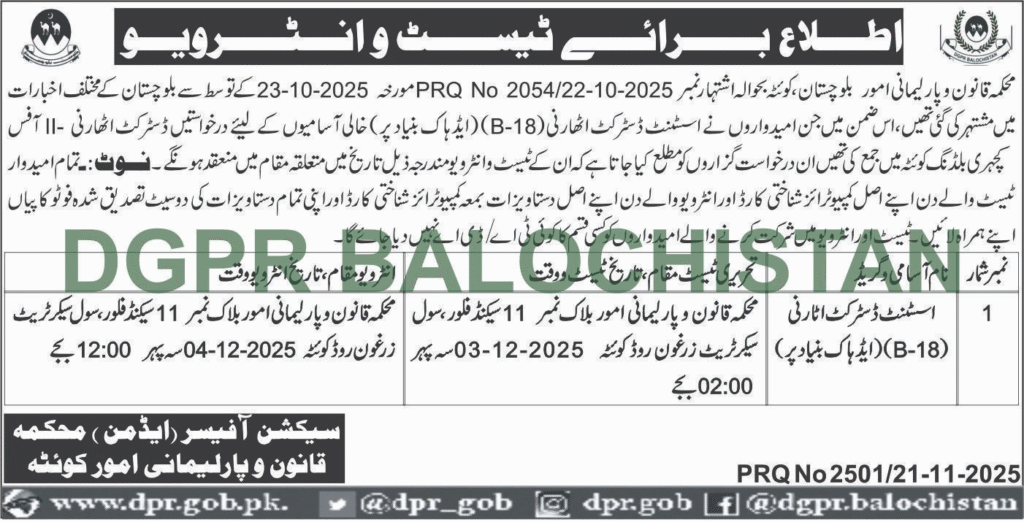 Interview Notice Assistant District Attorney (Ad Hoc) Vacancies, Department of Law & Parliamentary Affairs Balochistan