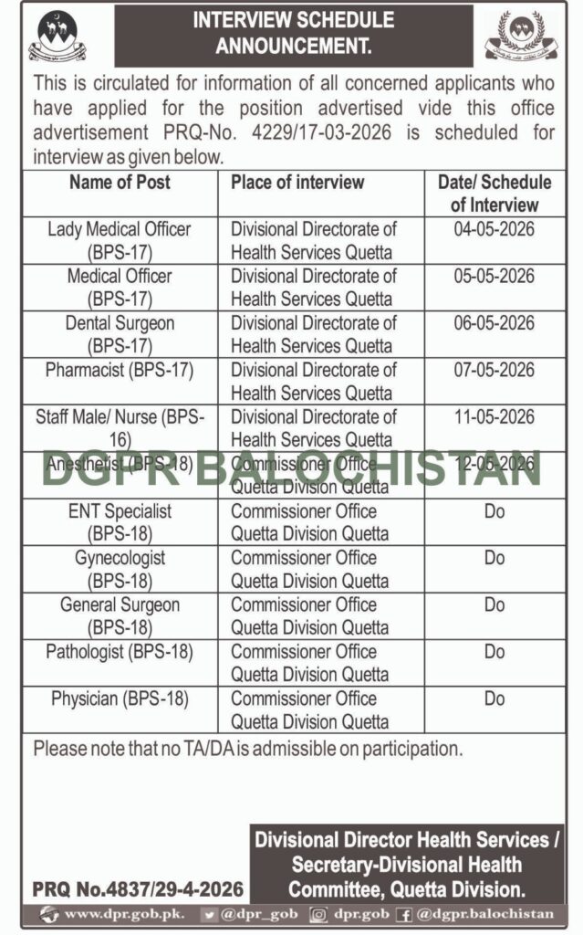 Interview Notice: Health Department Balochistan Announces Interview Schedule