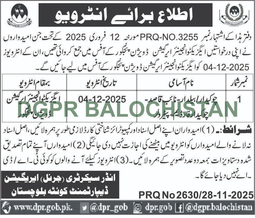 Adv-JobsInterview Notice – Irrigation Department BalochistanNovember 28, 2025November 28, 2025Comments (0)Shams Ur Rehman Anas Hussain